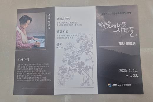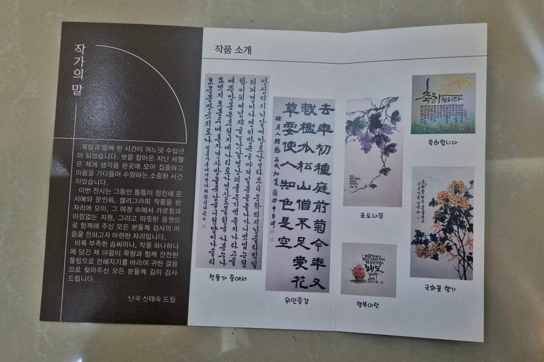 1월 20일 난곡 신태숙(70, 포항) 작가 측에 따르면, 이번 전시에는 서예·문인화·캘리그라피 작품 70여 점이 출품됐다. 별도의 개회사나 축사 없이 작가가 직접 방문객을 맞이하며 작품을 안내하는 이번 전시는 수양의 시간을 공유하는 자리로 꾸며졌다.