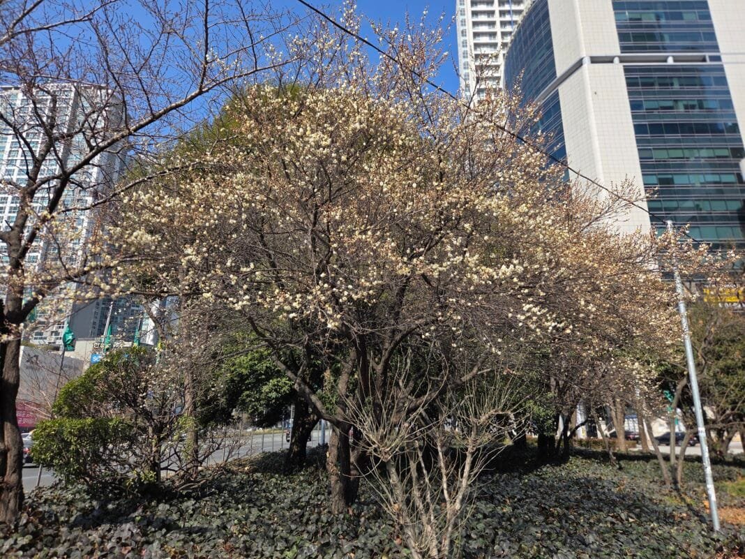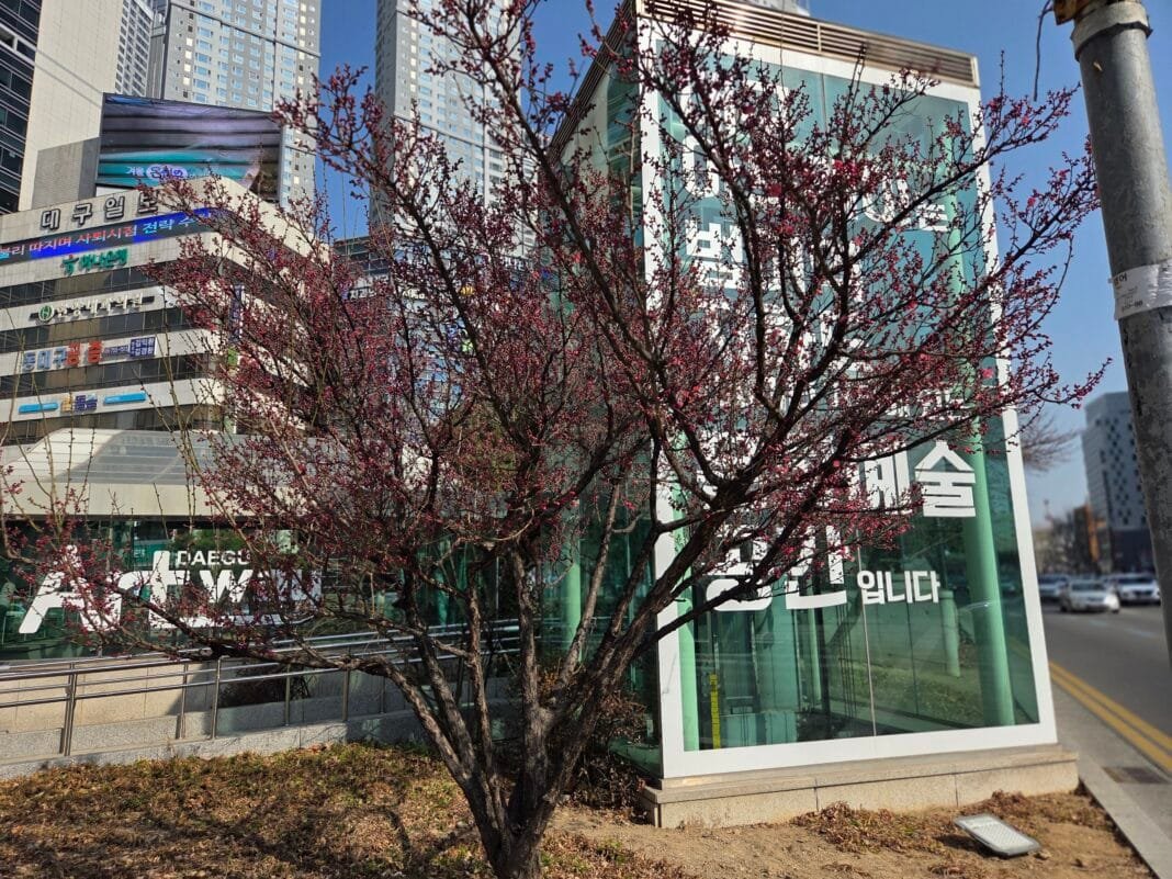 겨울부터 이어진 매서운 한파 속에서도 봄이 오고 있음을 알리는 매화가 대구 범어네거리 일대에서 조심스럽게 꽃망울을 터뜨리기 시작했다. ‘입춘에 장독 깨진다’는 옛말처럼 올해 입춘 무렵까지 치솟았던 한파는 전국적으로 유례없는 강추위였고, 대구 역시 예외가 아니었다. 그러나 최근 일주일간 기온이 영상권으로 회복되면서 범어네거리 두산위브 인근 신호대 주변에서 매화가 서서히 얼굴을 내밀었다.