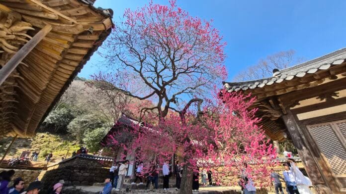 방문객들이 화엄사 경내에 있는 홍매화를 배경으로 기념사진을 찍고 있다. 사진=김영근